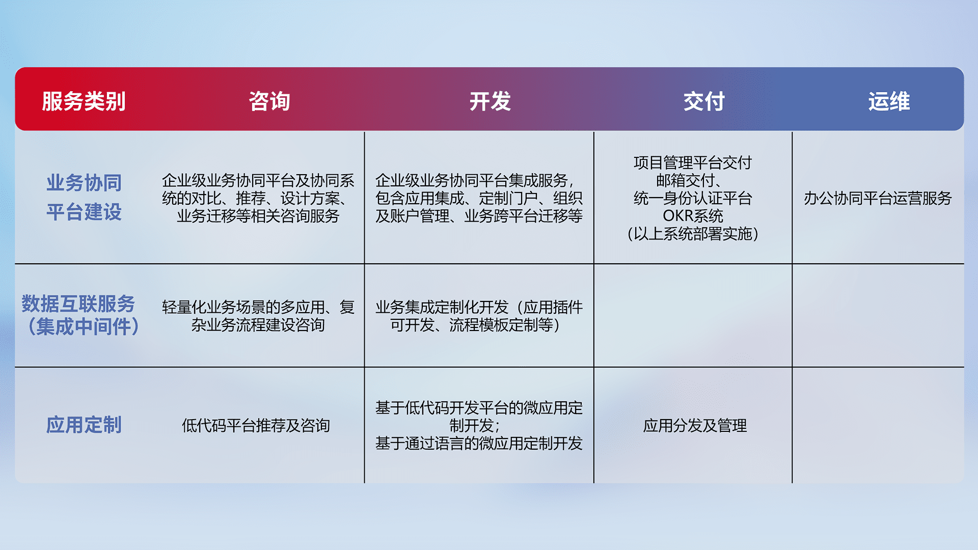 针对钉钉、、、企微、、、、IDaas等平台级产品提供产品的规划、、、方案、、、交付、、、定制化开发等服务,,,实现如统一协同办公、、、智能客户服务、、、混合会议管理、、智能数据查询、、、等业务场景,,,,实现数字化转型。。。